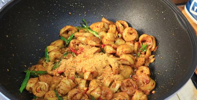 第五步、接着加入一勺辣椒面、一勺孜然粉、一勺生抽,大火将调料翻炒均匀,好吃的关键就是烧烤料了,我们倒入一包,然后继续把调料翻炒均匀即可。