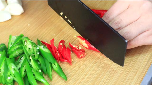 第一步、首先我们先切点配菜,绿辣椒洗净斜刀切段,小米椒也切成段,几个大蒜切成蒜末,切好后备用。
