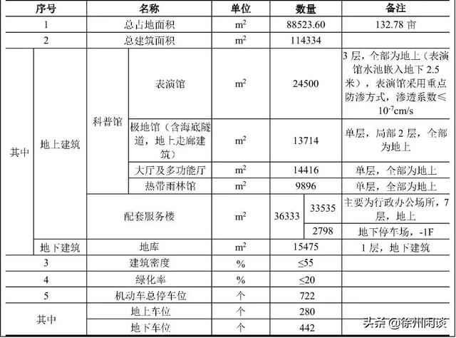 规划总面积88523.6㎡,总建筑面积114334㎡,其中地上建筑96061㎡(7F),地下建筑面积(地下停车场)18273㎡,包括了表演馆、极地馆(海底隧道)、大厅以及多功能厅、热带雨林馆等。