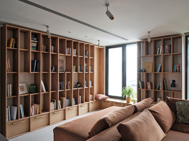 开放的阅读区是横跨窗户的大L型转角设计,在窗边留出沙发区,并增加插座和照明壁灯。