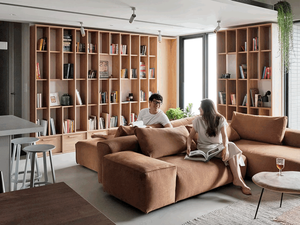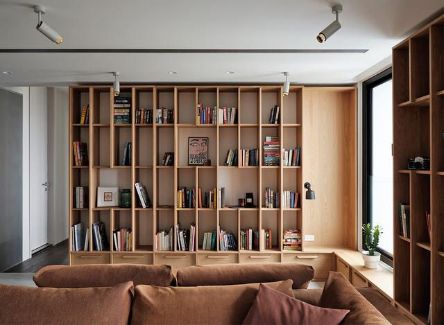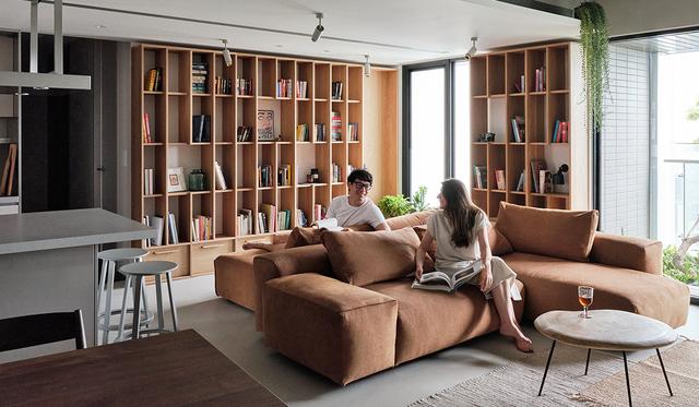一面是书墙,一面是电视墙,这样两个人就能保持一种亲密适当的距离感。