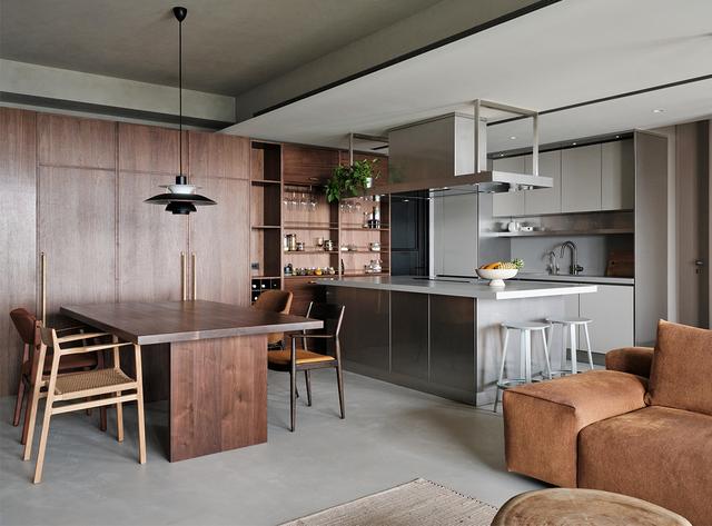 搭配厨房的胡桃木色真的很抢眼。这种沉稳的深木色适合各种家居装修风格。