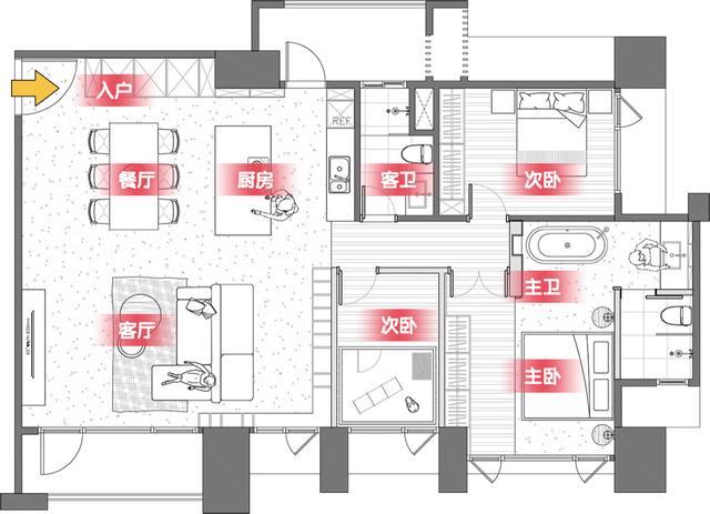 为了适应女主人的生活习惯,整个户型的设计没有过多考虑风水和格局的禁忌。