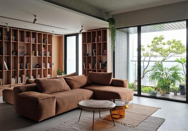 比如这种情况,棕色的沙发,大面积原木色的书柜,虽然不够亮,但是用在家装上就很出彩了。