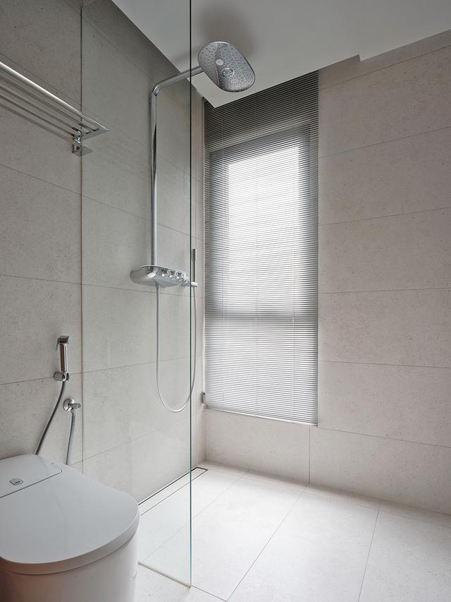 主卫生间的淋浴区摒弃了繁杂的墙面造型,采用了干净清爽的配色,出水口也采用了时下流行的隐形地漏设计。