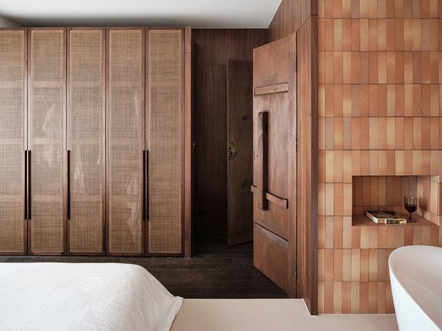 好的设计,从进门的那一刻起,视觉就被空间牢牢锁住。无论在走廊的哪个空间,这种惊艳的视觉感都一直延续着。胡桃木色衣柜搭配藤编柜门和复古木门,一股复古的中式韵味油然而生。