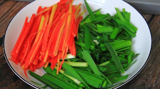 2、再准备一小把木耳,加入一勺盐,倒入开水浸泡,一小把韭菜清洗干净切成4厘米左右的小段,半根胡萝卜去皮后先切成薄片,然后再切成细丝,切好后装盘备用,大蒜切成蒜片,小米椒切成圈备用。