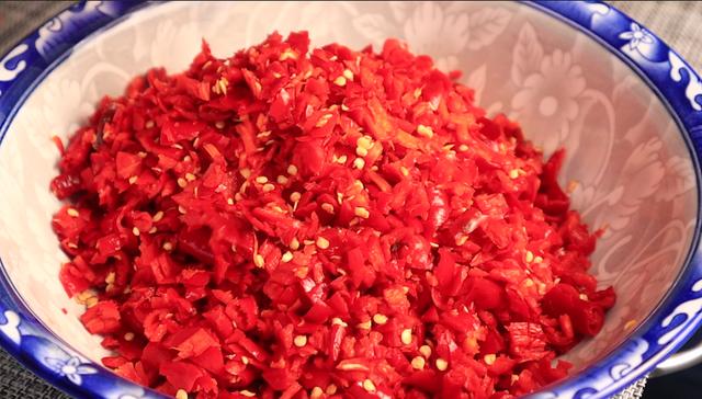 7、接着倒入姜蒜末炸出香味,然后倒入红辣椒,大火翻炒,把辣椒的水分炒出来,这个时候咱们要翻得勤一些,防止辣椒粘锅,大概6分钟左右,水分也炒出来了。