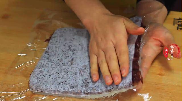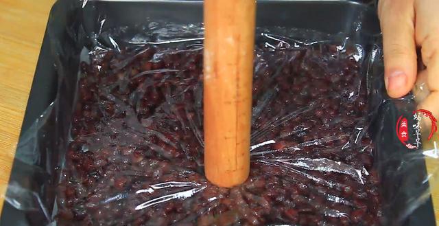 2,趁蒸红薯的时候,在模具里面铺上油纸,然后倒入一碗蜜红豆,将蜜红豆铺均匀,接着在蜜豆表面铺一张保鲜膜,用擀面杖将蜜豆压的紧实一些,用擀面杖滚一下,这样更平整,压好的蜜豆不会出现大的缝隙。