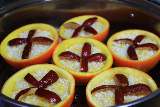 6,将糯米舀入橙子皮里面,差不多八分满就可以了,将剩下的汁水淋上,最后铺上切好的大红枣就可以蒸了。