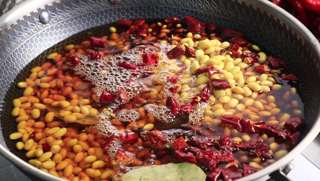 2、泡好的黄豆倒入锅里,加上八角桂皮香叶,干红辣椒,食盐,酱油,生抽,倒入没过黄豆的清水,把调料搅拌均匀,然后大火煮开。