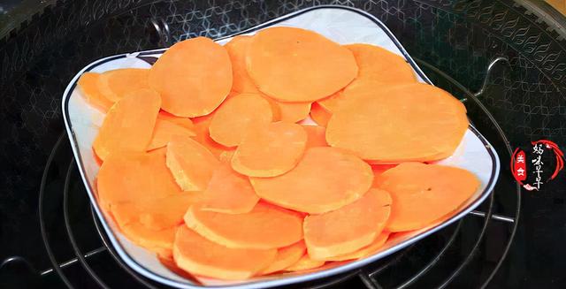 1,一个红薯去皮后先切成薄片,冷水上锅将红薯蒸熟。