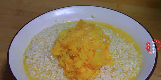 5,泡好的糯米轻轻一捏就会碎,说明刚好,然后将果肉倒入糯米里面拌匀,果肉最好不要用外面的一层皮,那样会影响口感,然后再加入适量白糖,增加一些甜度。