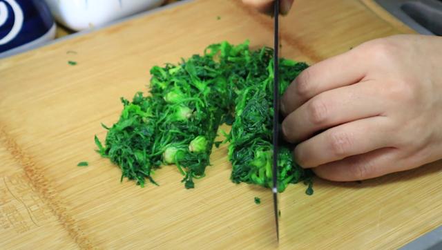 第四步、过凉之后,咱们把荠菜捞出来挤干水分,然后把荠菜放到案板上切碎,切碎后抖散放入碗中备用。