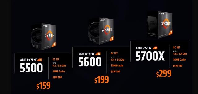 当然在4月4日除了锐龙7 5800X3D之外,还有一系列的AMD新处理器上市。特别受人关注的是,玩家期盼已久的全新Zen3 锐龙5处理器也要来了,主要有两个型号分别是锐龙5 5600和锐龙5 5500。其中锐龙5 5600,采用ZEN3架构(Vermeer核心),6核心12线程,二级缓存3MB,三级缓存32MB,频率3.5~4.4GHz,支持PCIe 4.0,首发价格199美元。锐龙5 5500,采用ZEN3架构(源自Cezanne核心,但不带GPU),6核心12线程,二级缓存3MB,三级缓存16MB,频率3.6~4.2GHz,支持PCIe 3.0,首发价格159美元。
