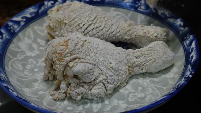 第七步、然后把鸡腿放到拌好的面粉里面,均匀地裹上一层,裹好后把表面多余的面粉抖掉,接着就可以炸了。