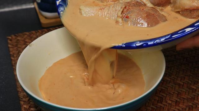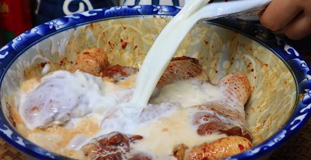 第三步、接下来就是重点了,鸡腿里倒入2包纯牛奶,加牛奶能让鸡肉更加鲜嫩多汁,盖上保鲜膜在冰箱冷藏2个小时。