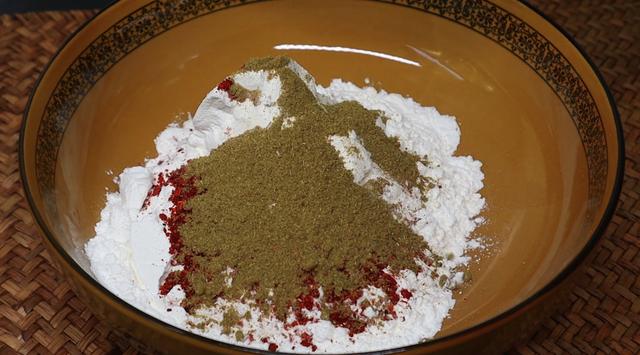 第四步、碗里放入相同比例的低筋面粉和玉米淀粉,各放2大勺就可以了,然后放胡椒粉、辣椒面、孜然粉、泡打粉,搅拌均匀备用,这个炸鸡粉就制作好了。