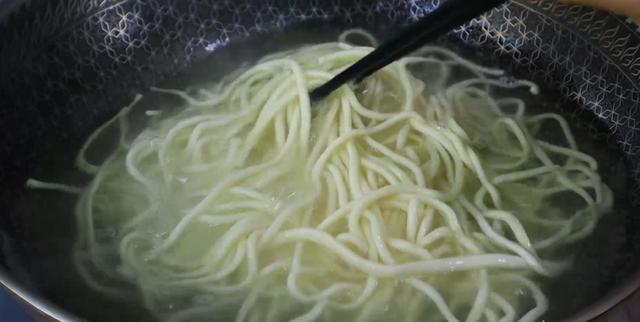 第七步、锅里烧水,水开后下入面条,无论宽面还是细面都可以,根据自己的喜好。可以加点油,面条不会粘在一起。