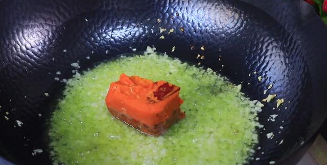 第三步、锅烧热倒入菜籽油,油热后先爆香一多半的蒜末,放一块牛肉火锅底料,这可是好吃的关键,大火把火锅底料炒出红油。