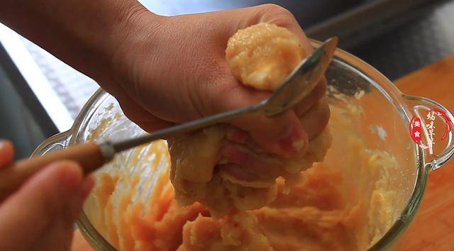 4,抓适量鸡肉用虎口挤一下,然后再用勺子一刮,一个鸡肉丸子就做好了,勺子上蘸点水,防止粘在勺子上。