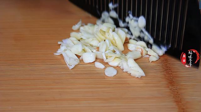 2,准备几粒大蒜,先压扁,然后剁成蒜粒备用,处理完了后放入盆子里。