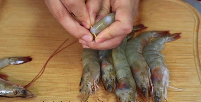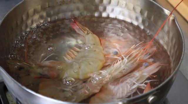 4、接着我们把大虾放入水中煮熟,加上点料酒去腥,差不多2分钟即可。出锅后剥掉虾壳,然后切小块即可。