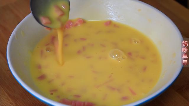 第一步,黄瓜洗净去掉两头,然后插成细丝备用。火腿肠切成小丁放入碗中,然后打入两个鸡蛋,将它们搅拌均匀。