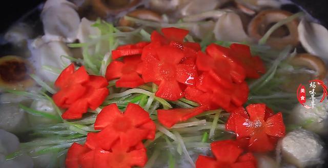 5,丸子全部下进去后倒入赤松茸大火煮开,然后放入萝卜丝,再来点胡萝卜,搅拌均匀后煮上5分钟。