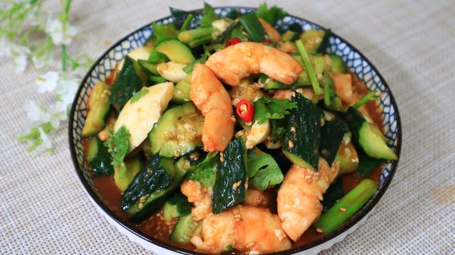 主要食材:黄瓜、鸡蛋、大虾、香菜、小葱