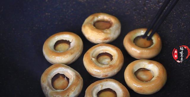 3,锅里倒入一些食用油,油热后放入口蘑底部朝下先煎金黄,金黄之后把口蘑再翻过来,小火煎出汁水,口蘑的汁水特别的鲜美,可以让菜品更加可口,几分钟后汁水全部煎出来了,咱们倒入适量的清水,这时候开中小火,把水微微煮开,准备开始下鸡肉丸子