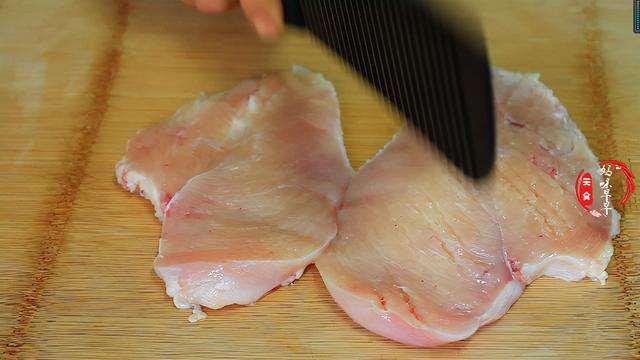1,清洗干净的鸡胸肉从中间分开,这样煎的时候更容易熟,然后用刀背把鸡胸肉敲一敲,这样不仅入味,还非常嫩,正反两面都需要敲一敲。