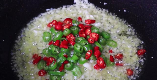 4、锅里多倒一点油,油热之后咱们把蒜末倒进去,小火翻炒,把蒜末炒香,炒过的蒜末少了生蒜的味道,吃起来特别的香,然后倒入辣椒翻炒几下,这样的辣椒吃起来不会辣,而且香味更突出,炒好后装入碗中备用。