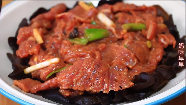 3,泡发好的木耳撕成小朵,摆入盘子里,接着把腌好的牛肉铺在木耳上面,冷水上锅,水开后中火蒸10分钟。