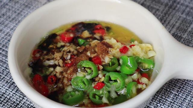 5、接着我们调一个料汁,将蒜末和辣椒放入碗中,加入一勺盐和白糖吗,两大勺生抽,一勺香醋、一勺蚝油,适量的辣椒油,将调料搅拌均匀备用。