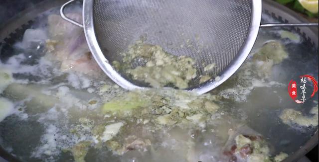 1、泡好的羊肉、羊骨需要焯水,冷水下锅,保持大火将水煮开,这个过程不要盖锅盖,让膻味可以散发出来。煮出血沫之后,用勺子将它打掉,然后继续再煮3分钟,捞出用温水冲洗干净。