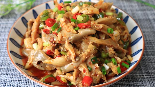 6、这个时候蘑菇也放凉了,咱们把它捞出来挤干水分,挤干水分后将蘑菇抖散,淋上料汁,再放上切好的葱花,带上手套将蘑菇抓拌均匀,多抓一会儿,让蘑菇能够入味,我还加了一些油泼辣子,这样颜色看起来会更加诱人。