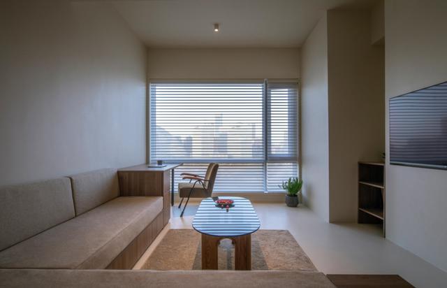 从睡眠区看整个客厅和落地窗,视野特别开窗。也许房子更小,但这是这对中年夫妇最舒适的家。