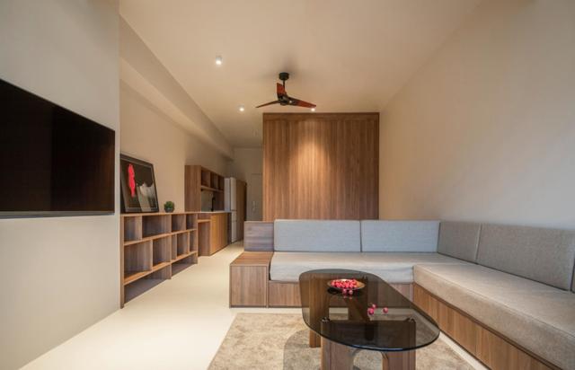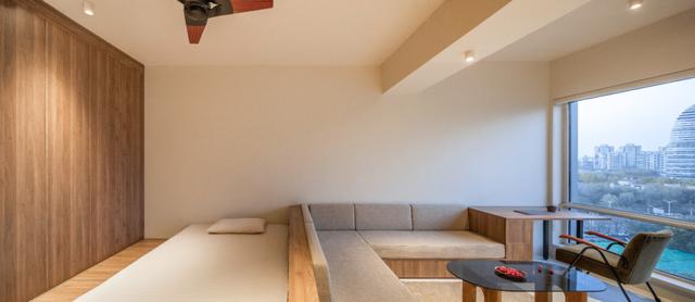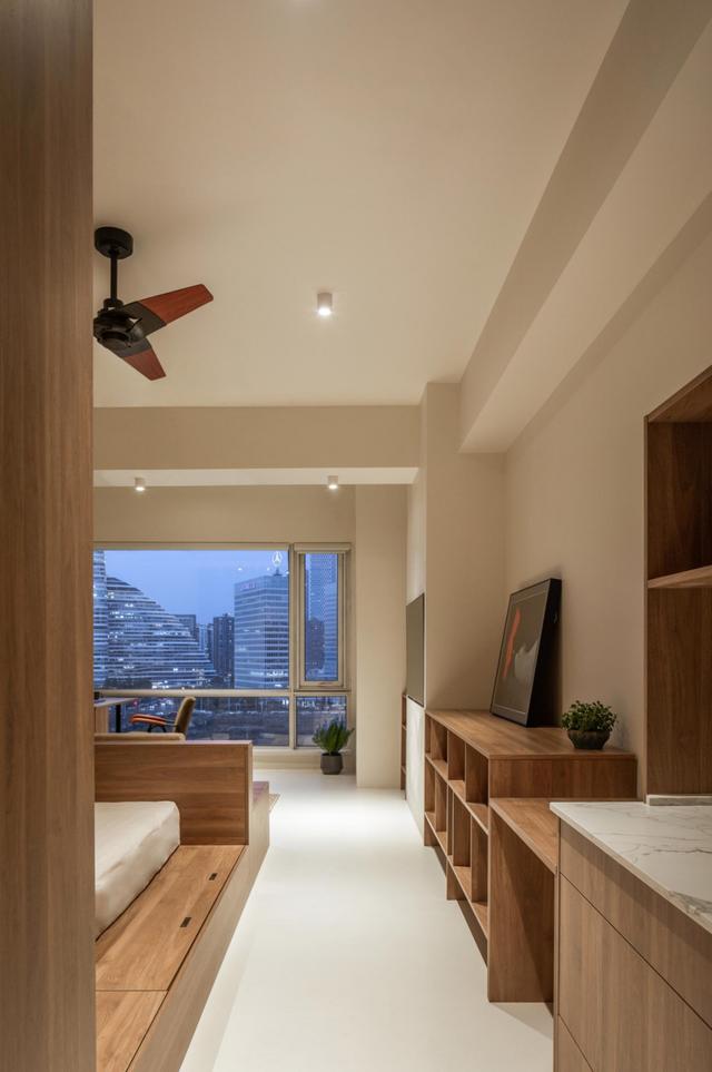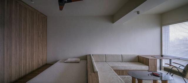 不得不说,这种将卧室设置在客厅区域的设计真的是相当有新意,让小户型有了更多的可能性。