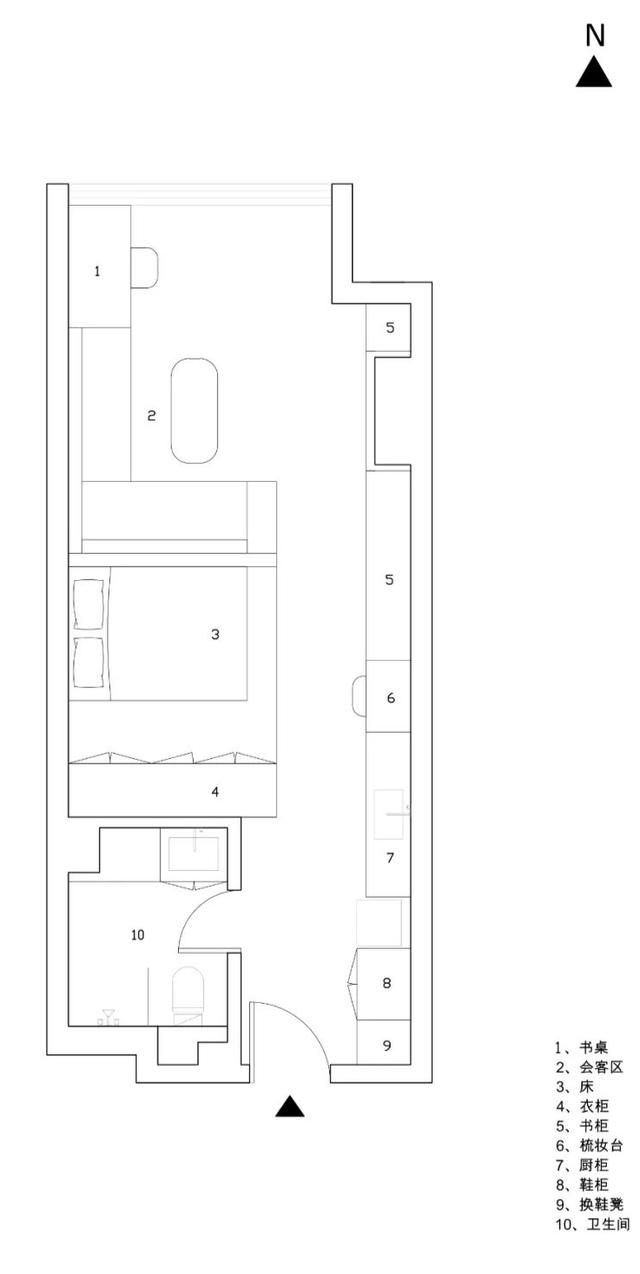 可以看到,在设计师的巧妙布局下,整个功能区分为睡眠区、客厅区、书桌区,每1的空间都得到了最充分的利用。