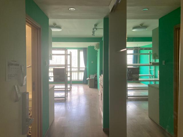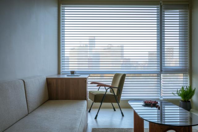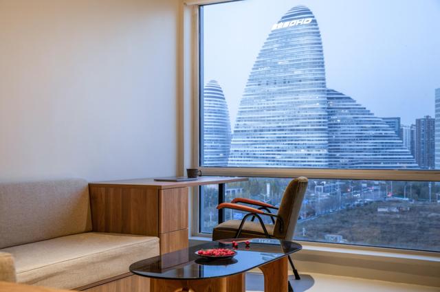 这种情况下只有一个落地窗,没有其他窗户。所以,如何利用这个窗户,成了装修中的一个难点。好在这个落地窗视野极佳,对面是望京soho。