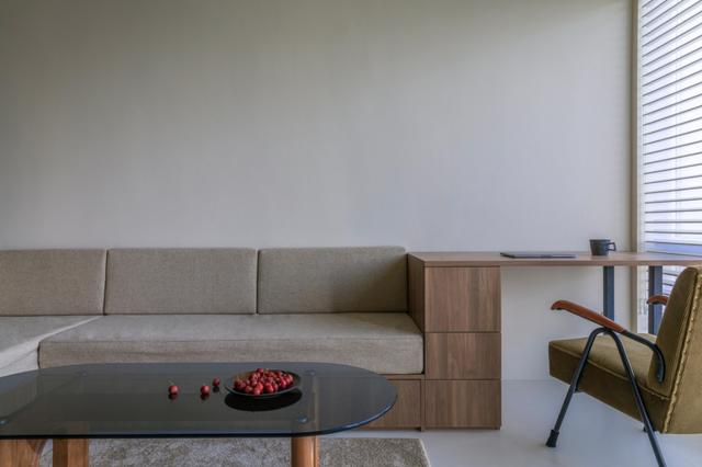 封闭式的客厅空间有一种舒适宽敞的氛围,足以满足主人和妻子的需求。沙发的使用也充满了别出心裁,下面有储物,上面有靠垫,让沙发感觉很舒服。
