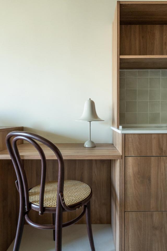 厨房的对面是超大的收纳区集合,既满足了小户型的收纳需求,又为业主阿姨打造了一个小小的更衣区。藤椅和一个复古的米色盆,让这个简单的家看起来更加复古。