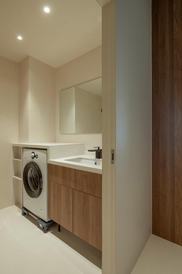 卫生间布置在入户门左侧,采用暗门设计,弱化了门框的存在感。同时,它既是厕所又是洗衣房。