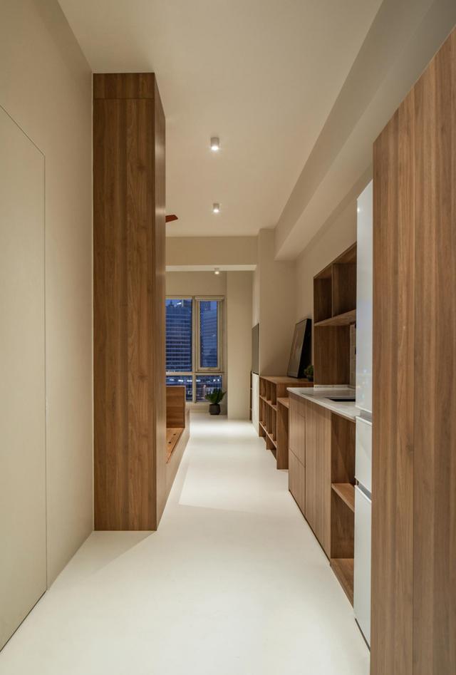 白色的地板和木质的橱柜形成视觉上的呼应,简洁自然。而且得益于不同立面的隔断设计,一进门就能看到落地窗而不是客厅,视野非常开阔。