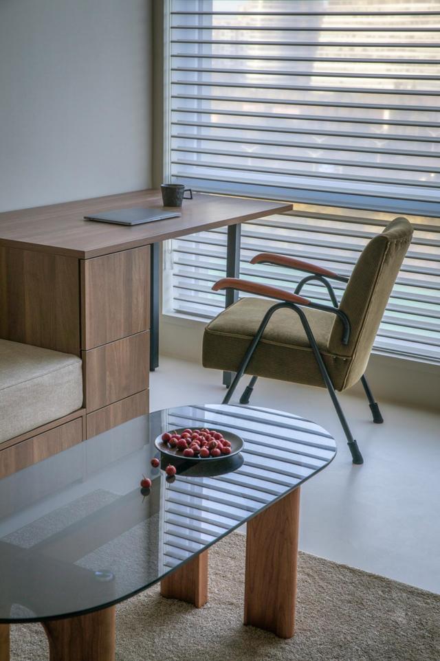 有了稍高的玻璃茶几,这个区域也成为了主人和他妻子的餐厅。