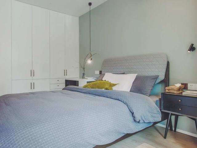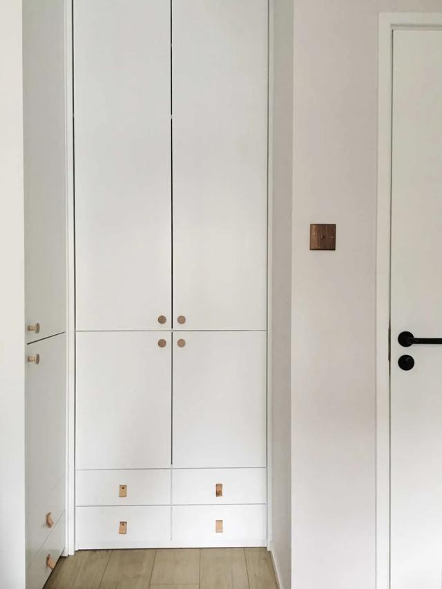 主卧简洁清新,衣柜现场制作,铜柄白漆柜门精致诱人。