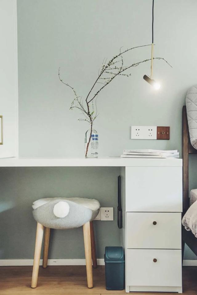 床的一侧放着床头柜,另一侧的衣柜延伸出一张简易的桌子。既可以当书桌,又可以当梳妆台,一举两得。