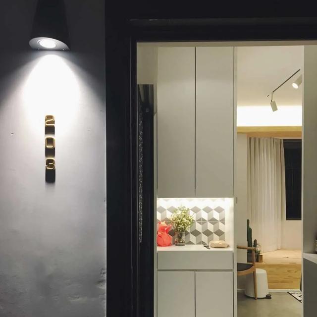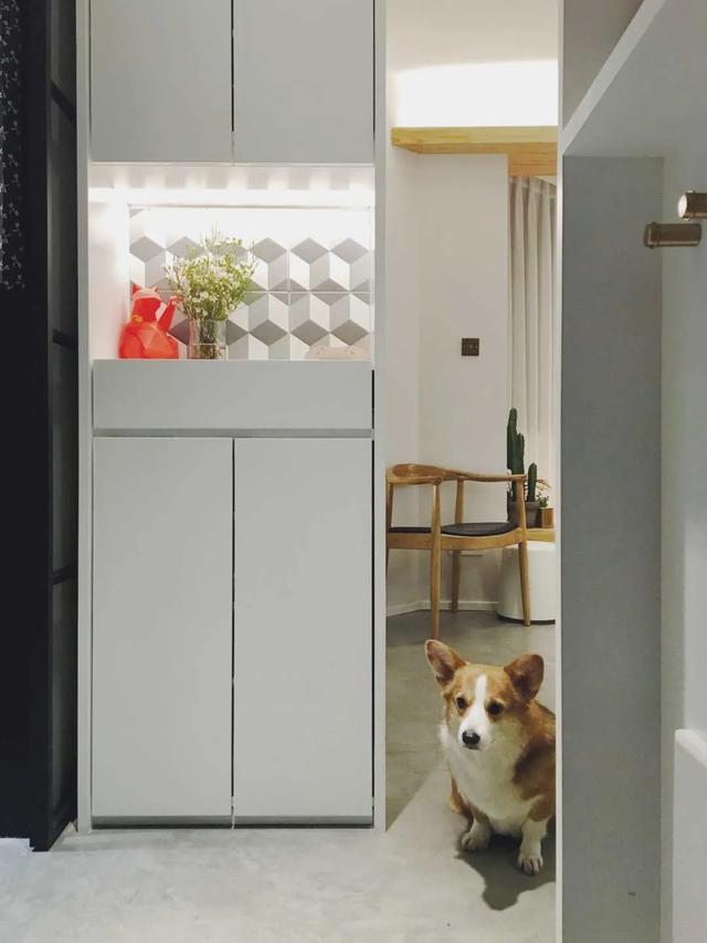 鞋柜采用上中下分体设计,中间留白几何图案瓷砖,增加趣味性。灯光,迎宾狗,营造回家的仪式感。