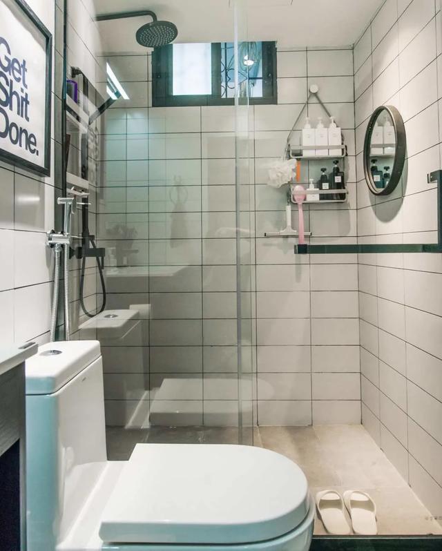 去掉了原有的隔断墙,卫生间干湿分离,透明玻璃隔断让空间更加宽敞。